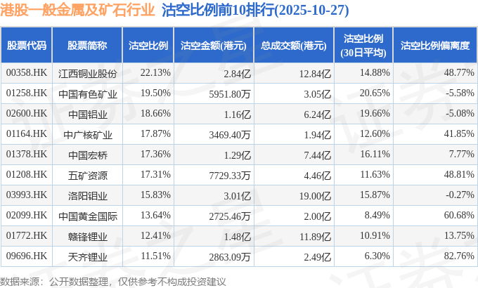10月27日港股一般金属及矿石行业沽空数据盘点,洛阳钼业、江西铜业股份、赣锋锂业沽空金额位居行业前三