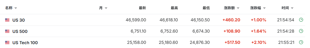 截至发稿,道琼斯指数期货涨1%,标普500指数期货涨1.64%,纳斯达克100指数期货涨2.1%。