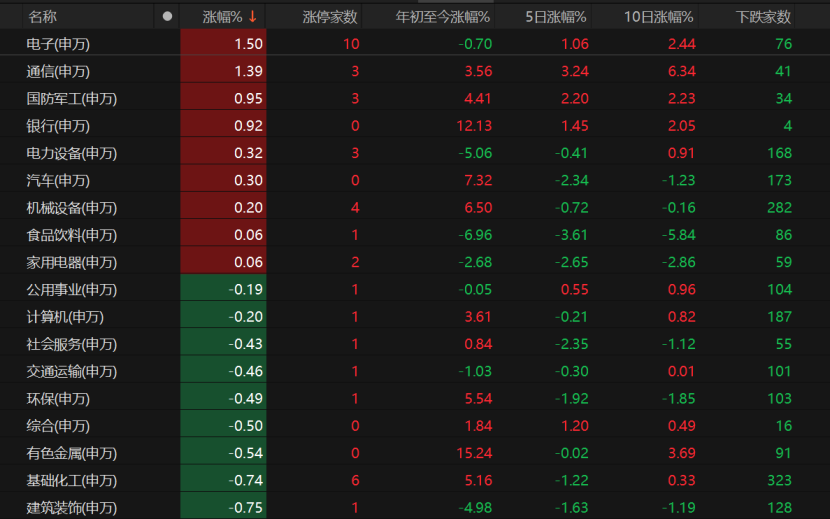 板块也收跌居多,科技板块涨势不错,电子、通信、国防军工、电力设备、汽车、机械设备均收涨,银行板块涨近1%护盘。电子板块掀起涨停潮,19只个股涨停,清越科技、逸豪新材、科翔股份、联建光电20cm涨停。