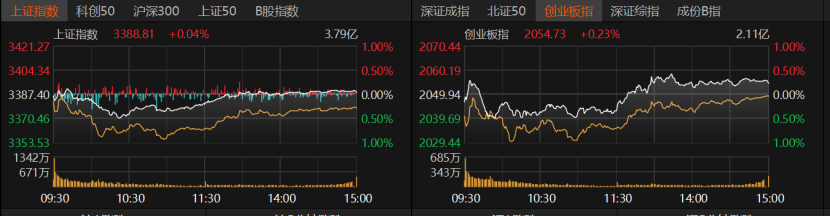 今日,A股继续震荡整理,沪指微涨0.04%报3388.81点,创业板指收涨0.23%报2054.73点。科创50、沪深300微涨,上证50、北证50微跌。交易量上,今日A股全市场成交额较昨日微跌,达到1.22亿元。
