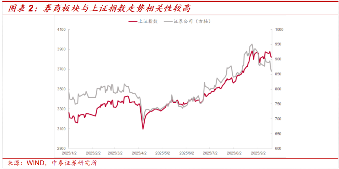 本周A股整体维持震荡格局,或主要由两方面因素共同作用。首先,美联储议息会议降息落地,形成影响市场的重要外部变量。由于“降息预期”已被市场充分交易,此次结果并未超预期,因而在落地后引发投资者情绪的回落,风险偏好短期有所降温。其次,本周券商板块表现偏弱,对指数走势形成拖累。证券公司指数本周下跌3.55%,相较于8月25日的阶段高点已回撤9.63%。从历史走势来看,券商板块与大盘指数相关性较高,券商股通常在行情启动期扮演“信号板块”,而近期走势低迷,被部分资金视作市场降温信号,进而拖累整体指数表现。